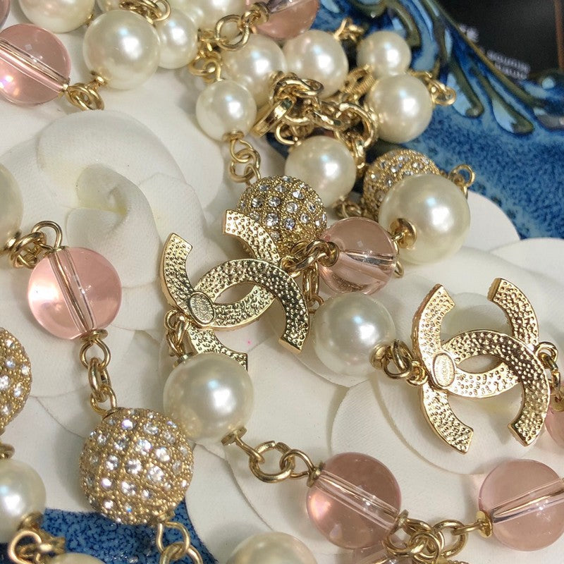 - Yellow Gold-colour hardware, Black, Pink Pearls & Pink Crystals